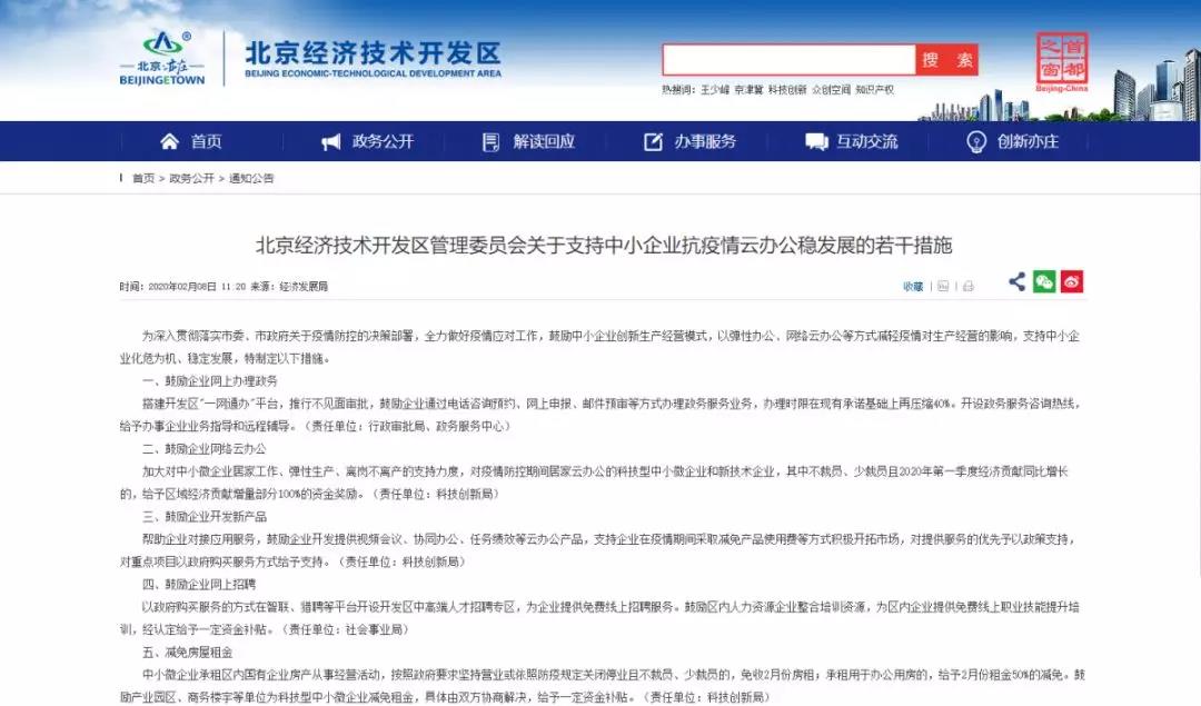2月8日,北京经开区《关于支持中小企业抗疫情云办公稳发展的若干措施》正式对外发布,为全力做好疫情应对工作,北京经开区通过“四鼓励一减免一服务”,鼓励企业创新生产经营模式,以弹性办公、网络云办公等方式减轻疫情对生产经营的影响,支持中小企业稳定发展。