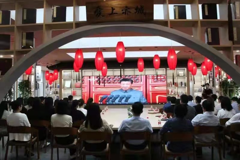 △尚亦城科文集团党员及群众代表在乡情书斋收看庆祝大会直播