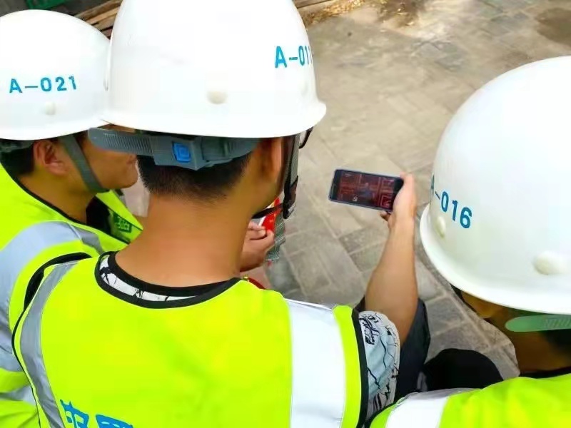 在施工现场建筑工人们赶在上午开工之前收看庆祝中国共产党成立100周年大会。