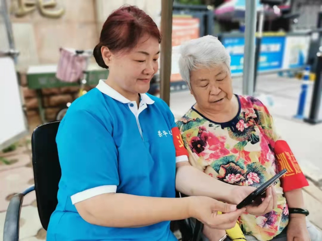 △志愿服务岗志愿者用手机收看庆祝大会直播