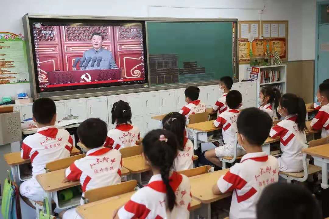 在校园里,老师组织同学们一起收看了庆祝中国共产党成立100周年大会,聆听习近平总书记讲话。
