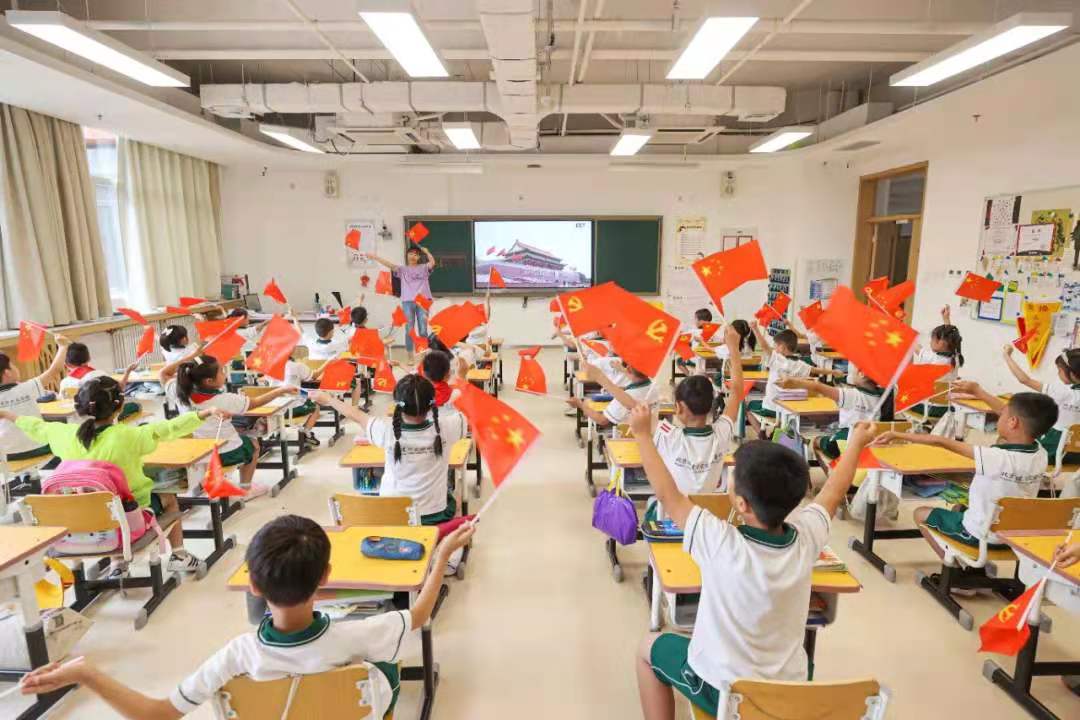 △建华实验亦庄学校同学们挥舞着国旗、党旗一起收看庆祝大会直播