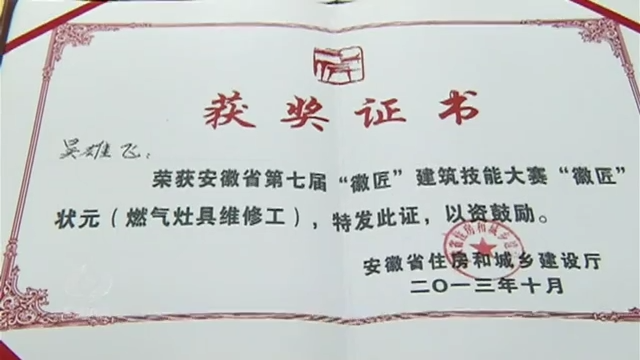 吴雄飞的努力让他的专业技术突飞猛进,别人需要40分钟才能完成一台燃气灶的拆解和安装,他只需要一半的时间。2013年,吴雄飞在安徽省建筑技能大赛燃气灶具维修工比赛中脱颖而出,获得了“徽匠状元”的称号。