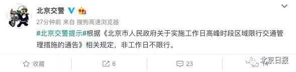北京市交管局今晚通过官方微博发布消息,根据《北京市人民政府关于实施工作日高峰时段区域限行交通管理措施的通告》相关规定,非工作日不限行。