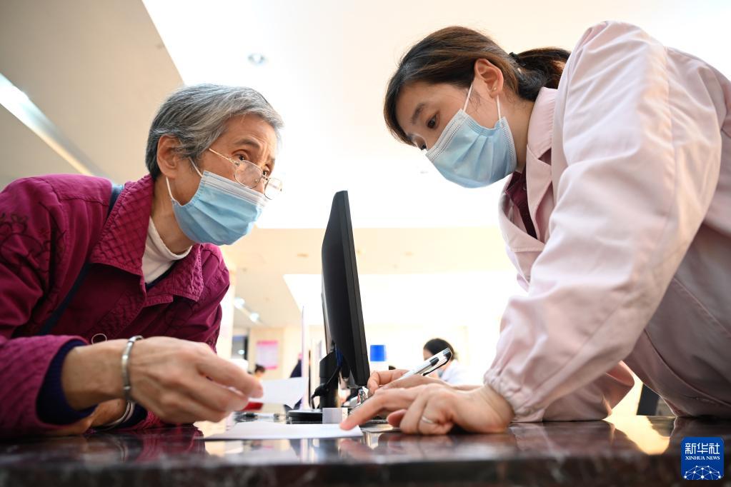 福建省三明市第一医院医保办工作人员(右)向前来咨询药品报销问题的居民讲解相关政策(2020年11月18日摄)。